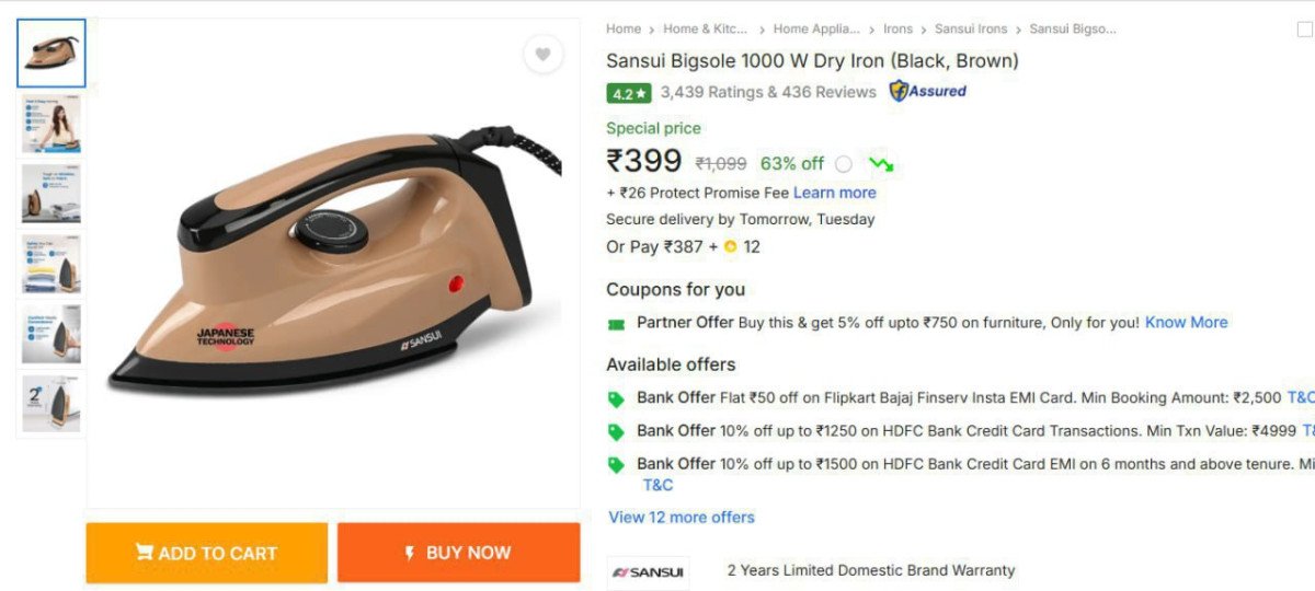 Flipkart | Sansui Bigsole 1000 W Dry Iron@399 🛍️ �